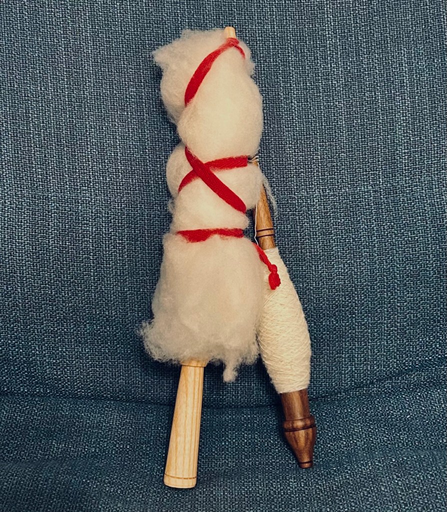 I started spinning with a distaff a few years ago. I mostly spin with a spindle rather than with a spinning wheel. I’ve always just held the fibre a bit awkwardly to keep it from getting tangled up but eventually I got tired of it. Honestly, the distaff just makes so much sense! My current favourite distaff is one based on a find from the Oseberg ship burial in Norway, which is dated to the 9th century CE. I bought mine from Niddy Noddy UK on Etsy. I was worried that the handle would be awkward to hold while spinning, but I don’t have any trouble at all. In case you’re curious, the spindle is also from the same maker and is a reproduction of a whorl-less French spindle with a spiral cut groove at the tip. Both are an absolute joy to to use even though they are based on artefacts that date to very different periods!